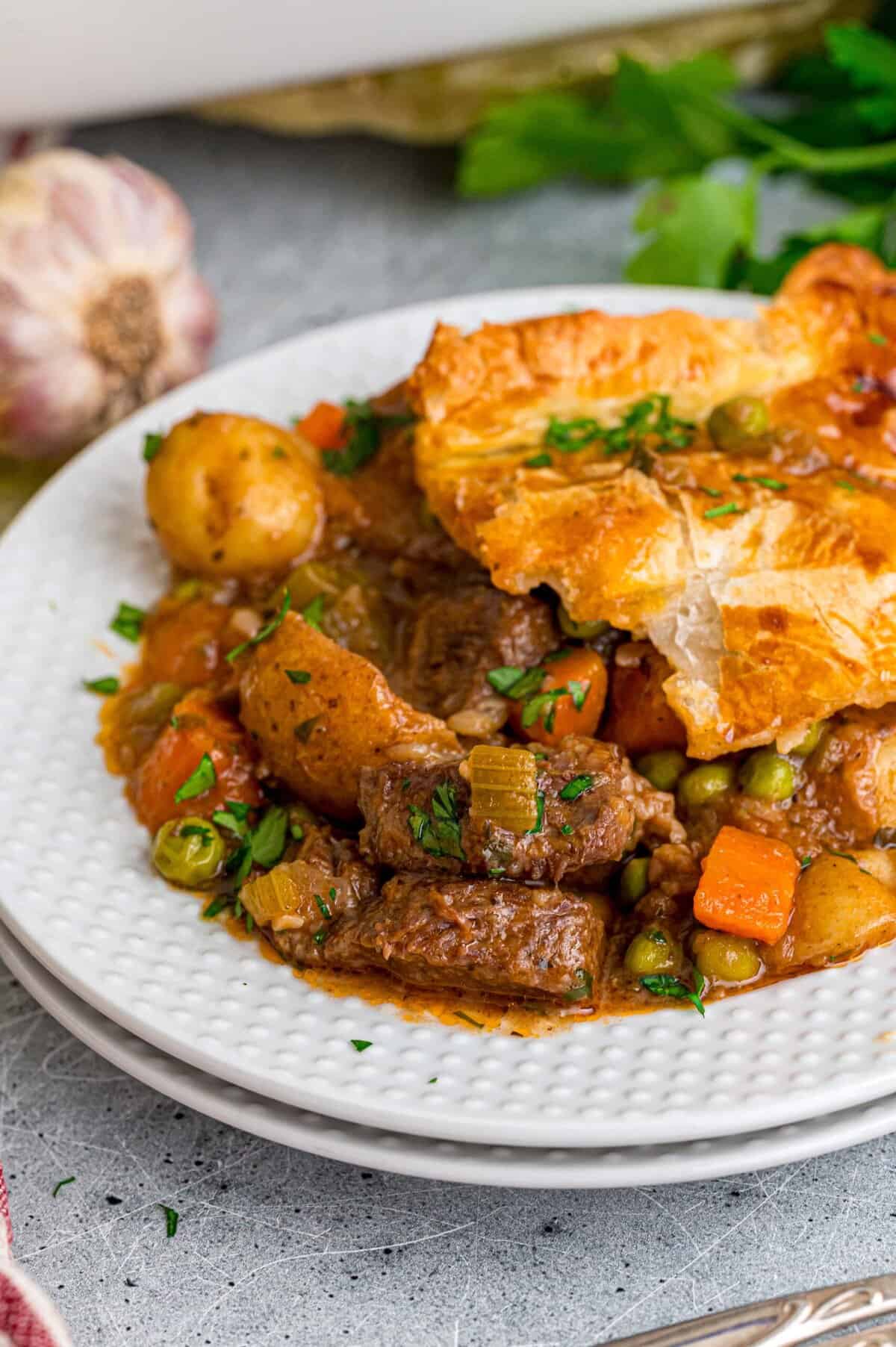 - Let rest before serving. Give the beef pot pie 5-10 minutes to cool before diving in. This lets the stew thicken a bit. Plus, it’ll be way too hot to enjoy at first anyway!