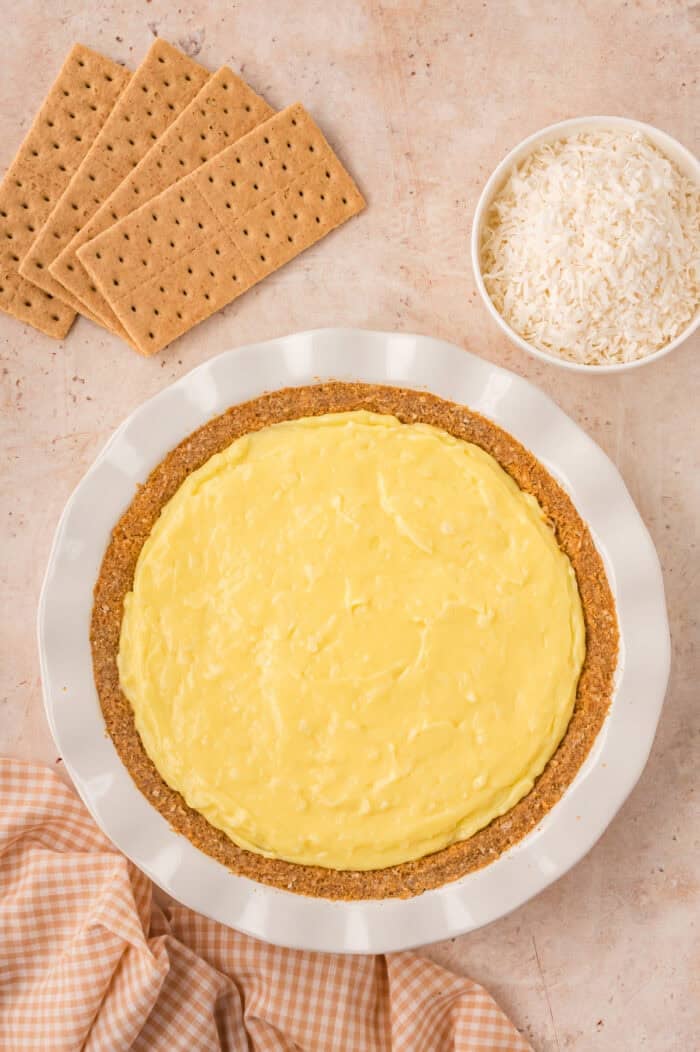 - Make the crust. Blend the graham crackers and shredded coconut in a food processor until fine crumbs form. Mix in the melted butter. Press firmly into the bottom and up the sides of the pie dish. Chill for 30 minutes or bake for 10 minutes at 350F.