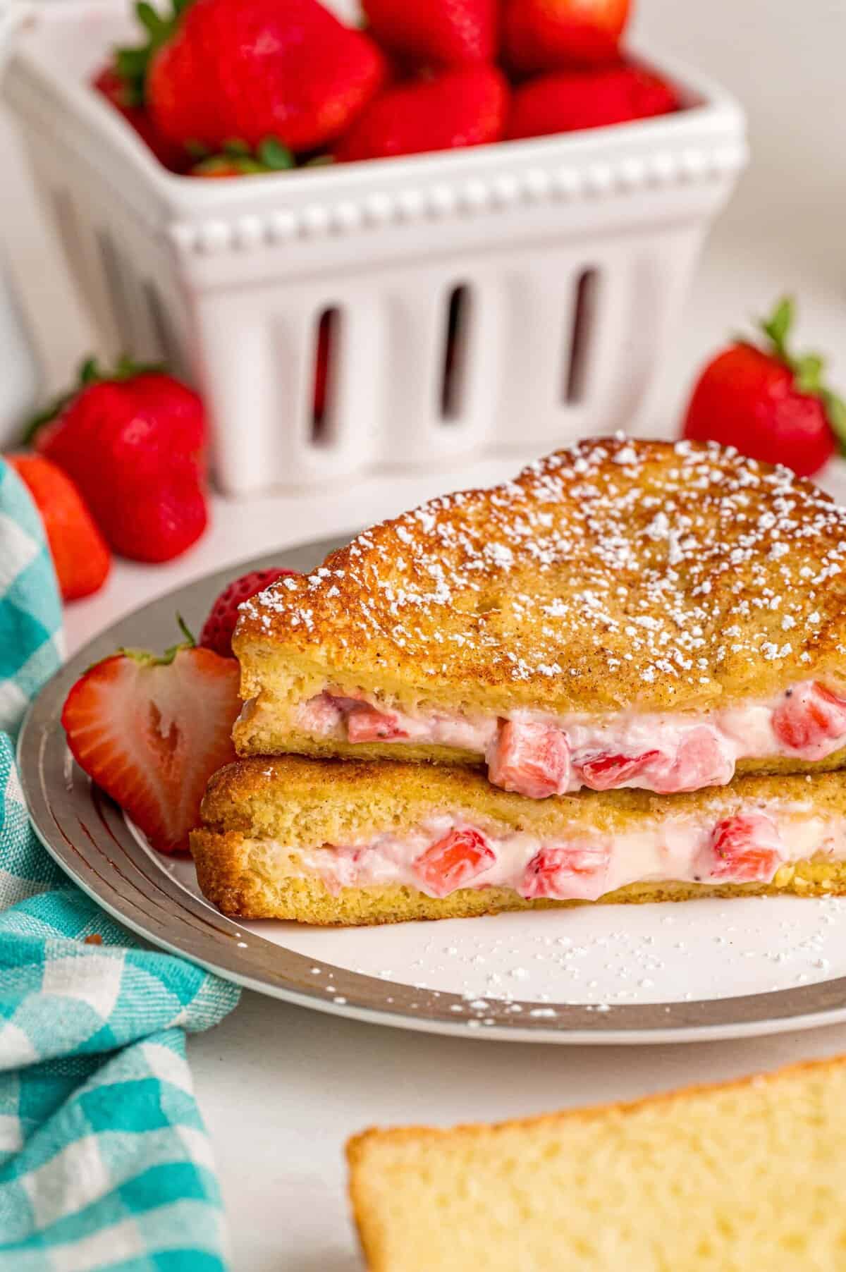 A strawberry and sweet cream cheese filling is layered between two thick pieces of brioche bread. The entire sandwich is dipped in the egg batter then it’s cooked until golden brown. The end result is essentially a French toast sandwich – but stuffed French toast just sounds fancier!