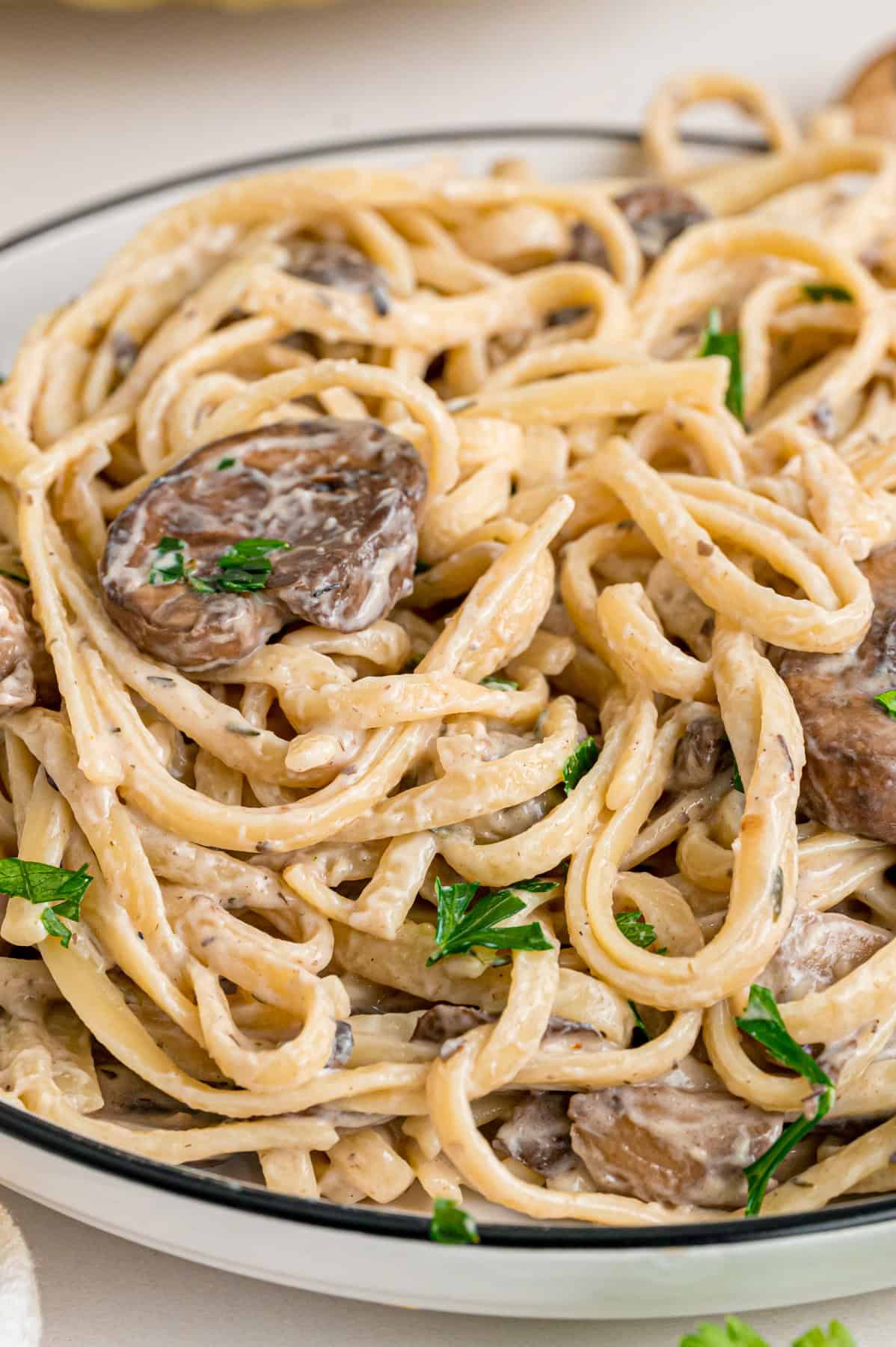 Pasta is one of my go-to solutions for dinner during busy seasons. It’s filling, it’s easy, and there are so many different variations. We rotate through family favorites like Philly cheesesteak pasta and chicken pesto pasta regularly. This creamy mushroom pasta is a new favorite. It’s vegetarian, so not only is it a go-to for busy weeknights, it’s become a go-to when we have vegetarian guests.